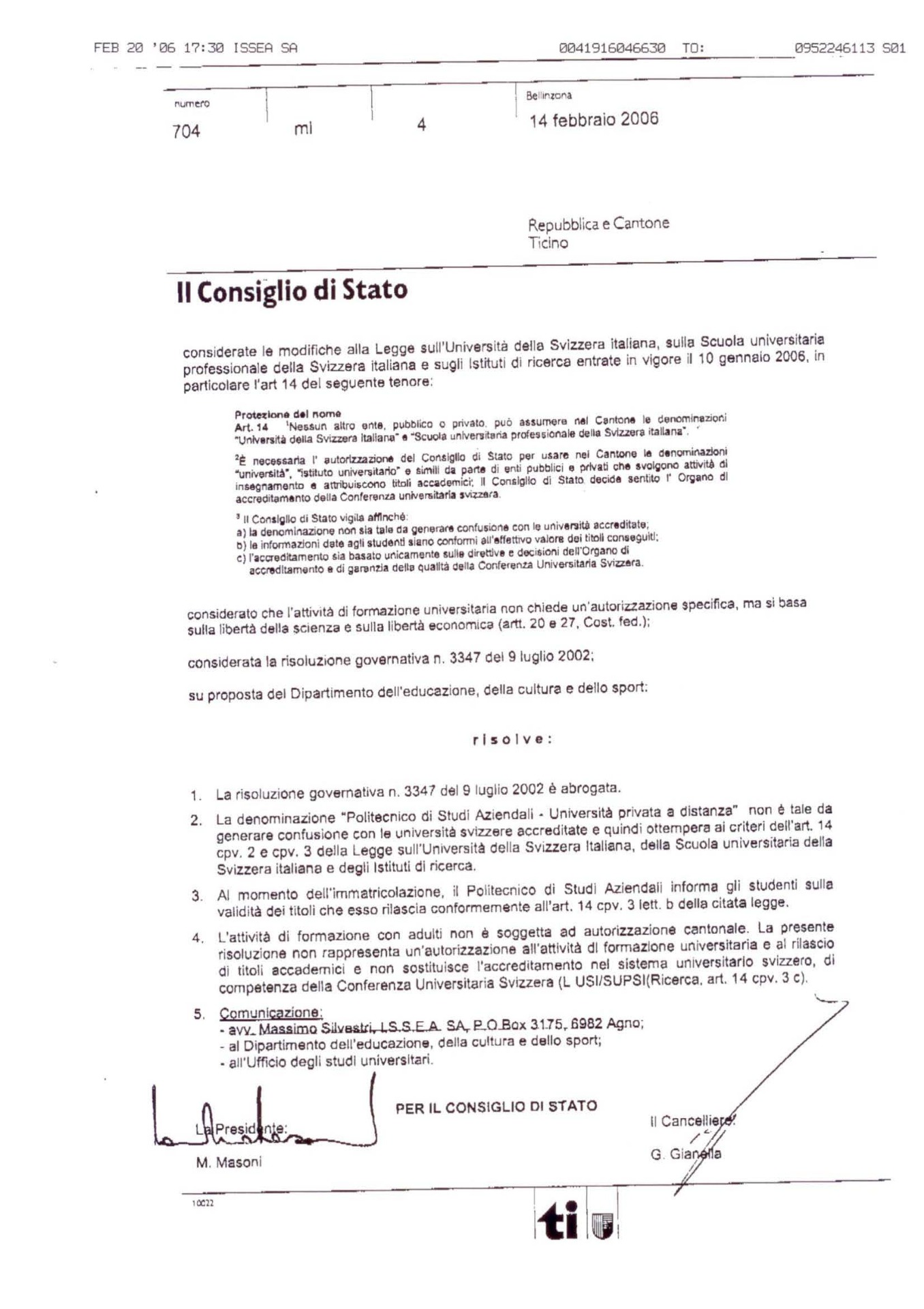 Precedente Autorizzazione Governo Cantone Ticino alla denominazione Università